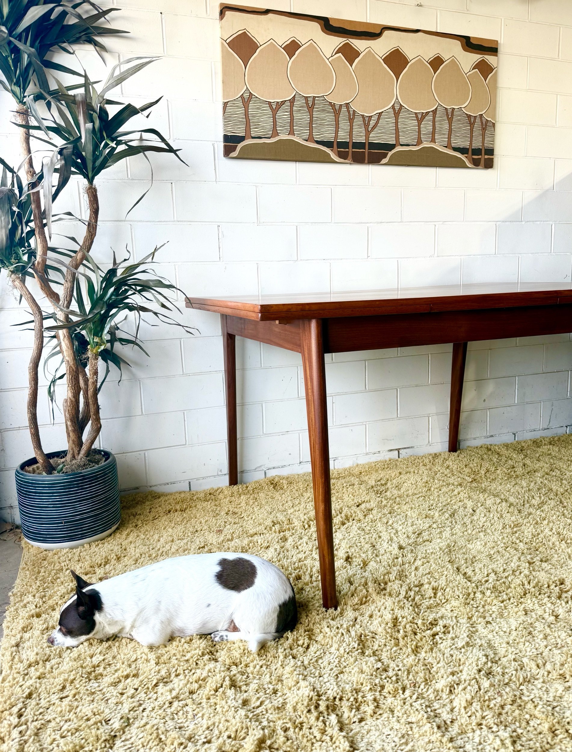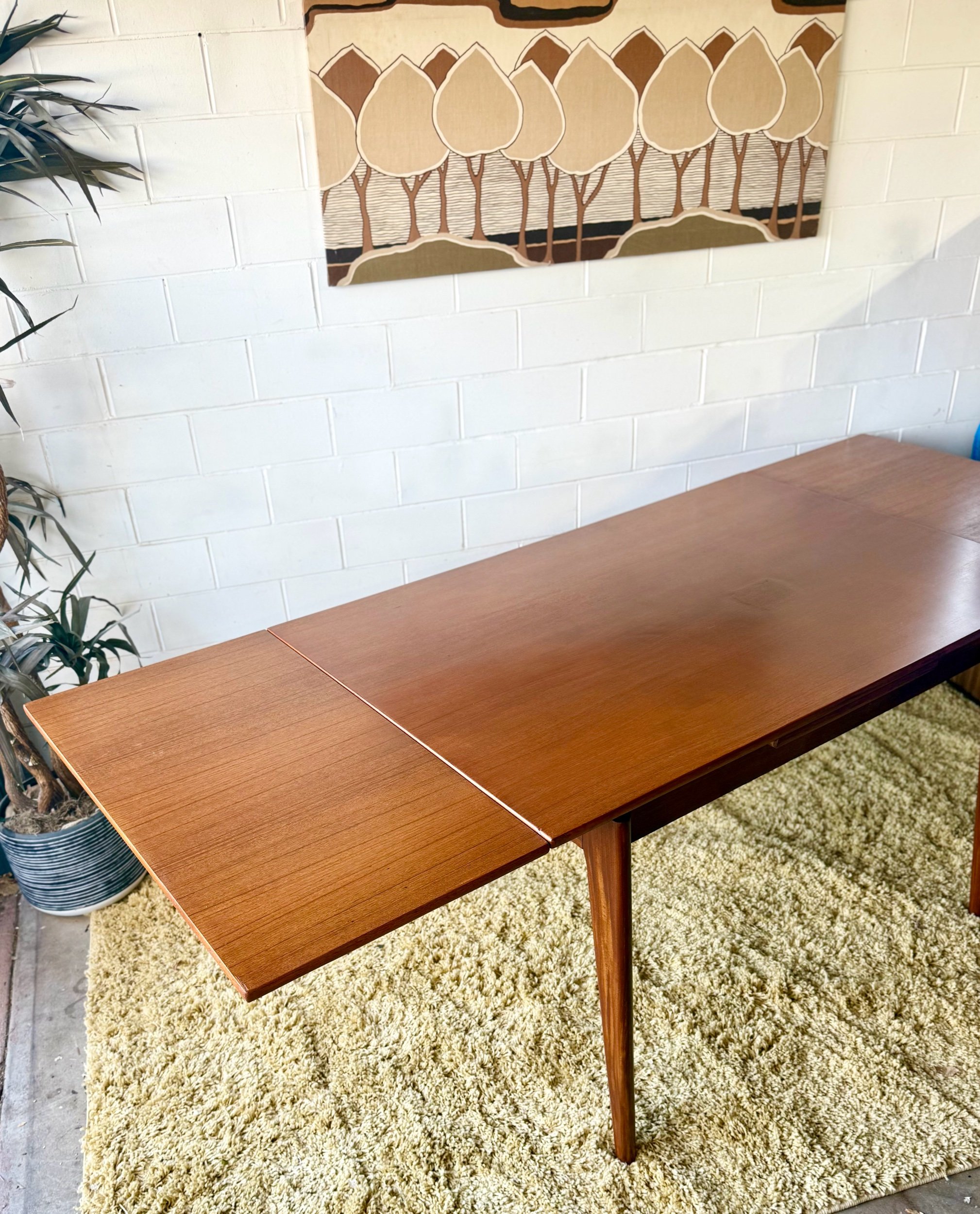 We bought this gorgeous teak table that someone had patched hoping to redo the patch better. Unfortunately they also over sanded the veneer and we were unable to redo the patch without sanding thru the teak. Sooooo we did our best to disguise their patch and we are offing this table at a C-grade price. If it does not meet our standards we cannot charge full price. If you’re a person who always has a centerpiece on your table then this is the perfect table for you! I tried to photograph and video it from all angles to show the patch. If you’d like different angles please let me know.