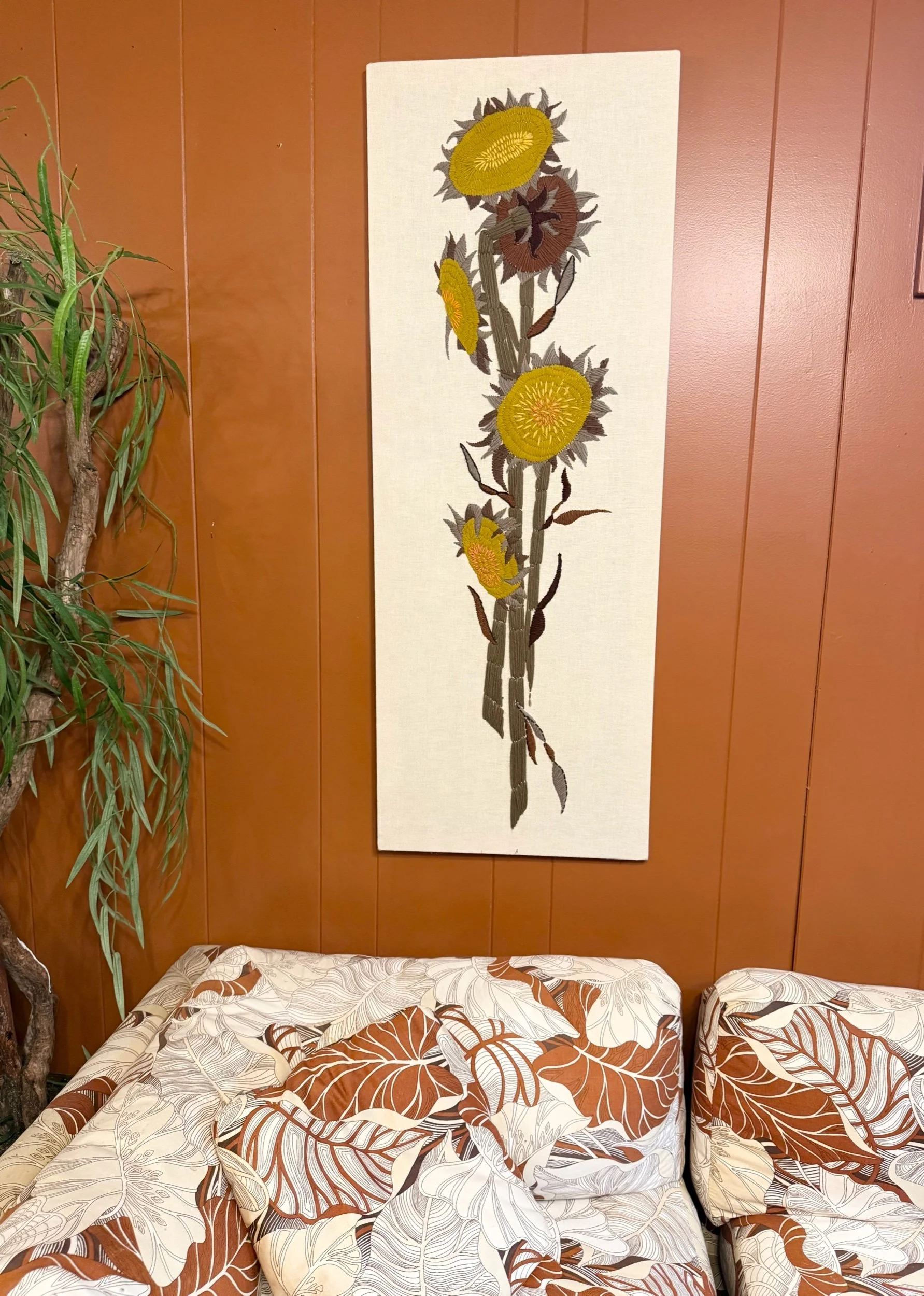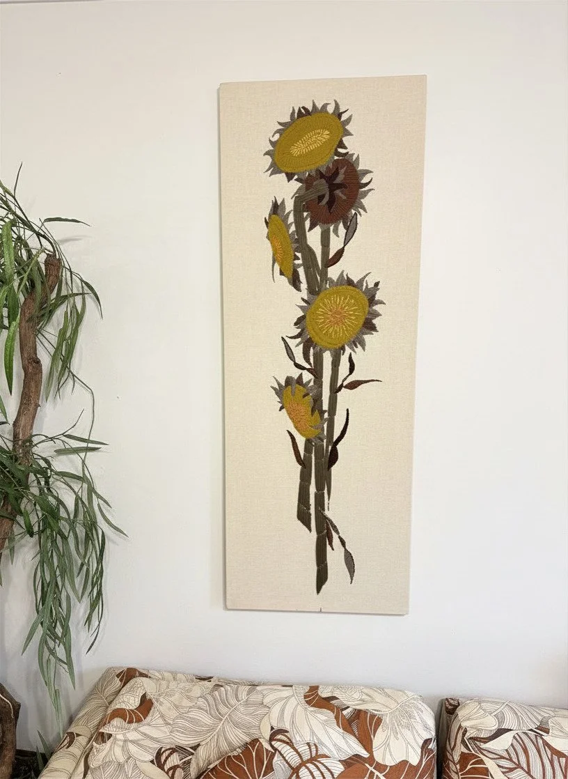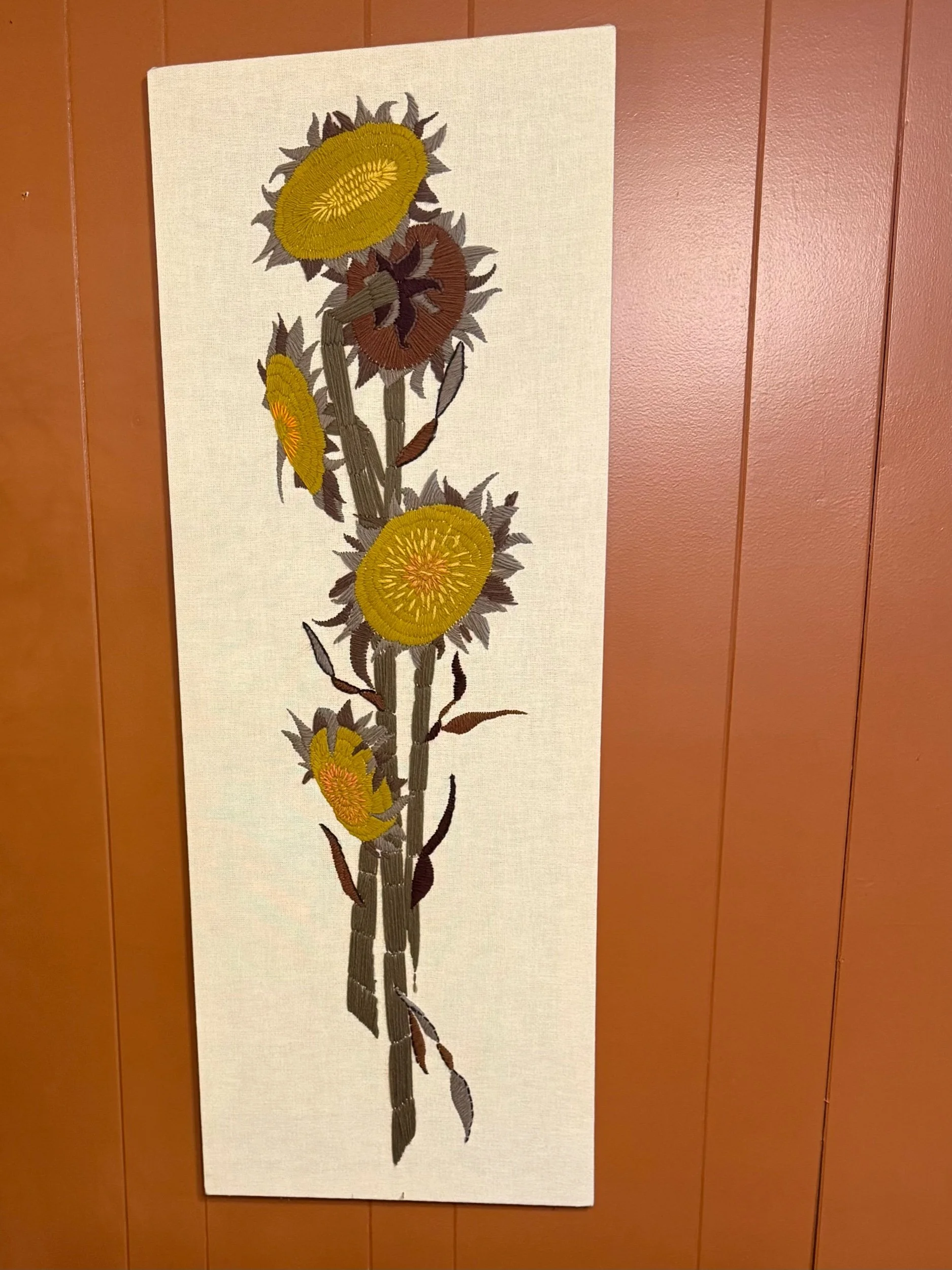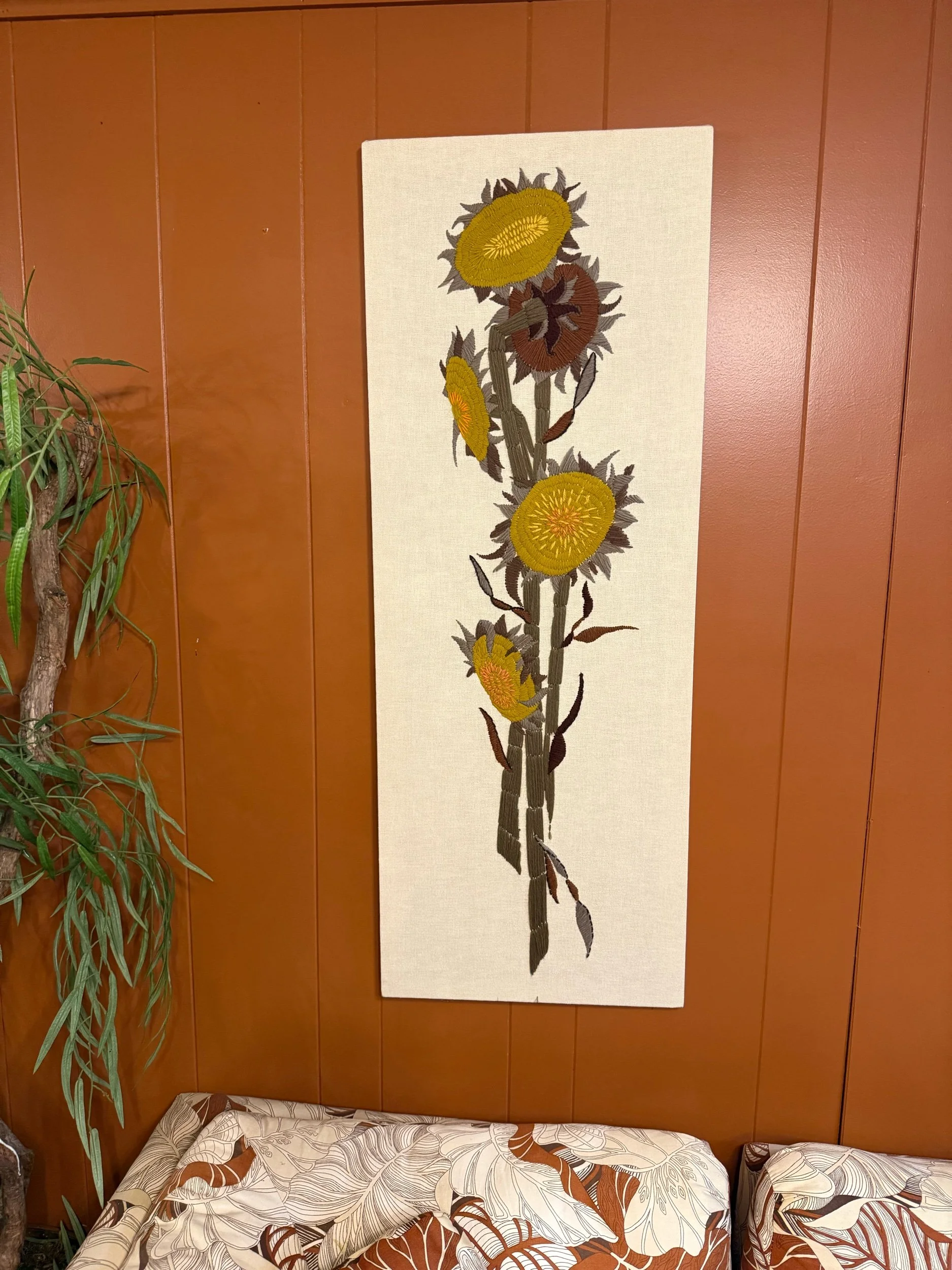 Vintage crewel embroidery of sunflowers, design by Paragon Needlecraft (in collaboration with Good Housekeeping magazine)