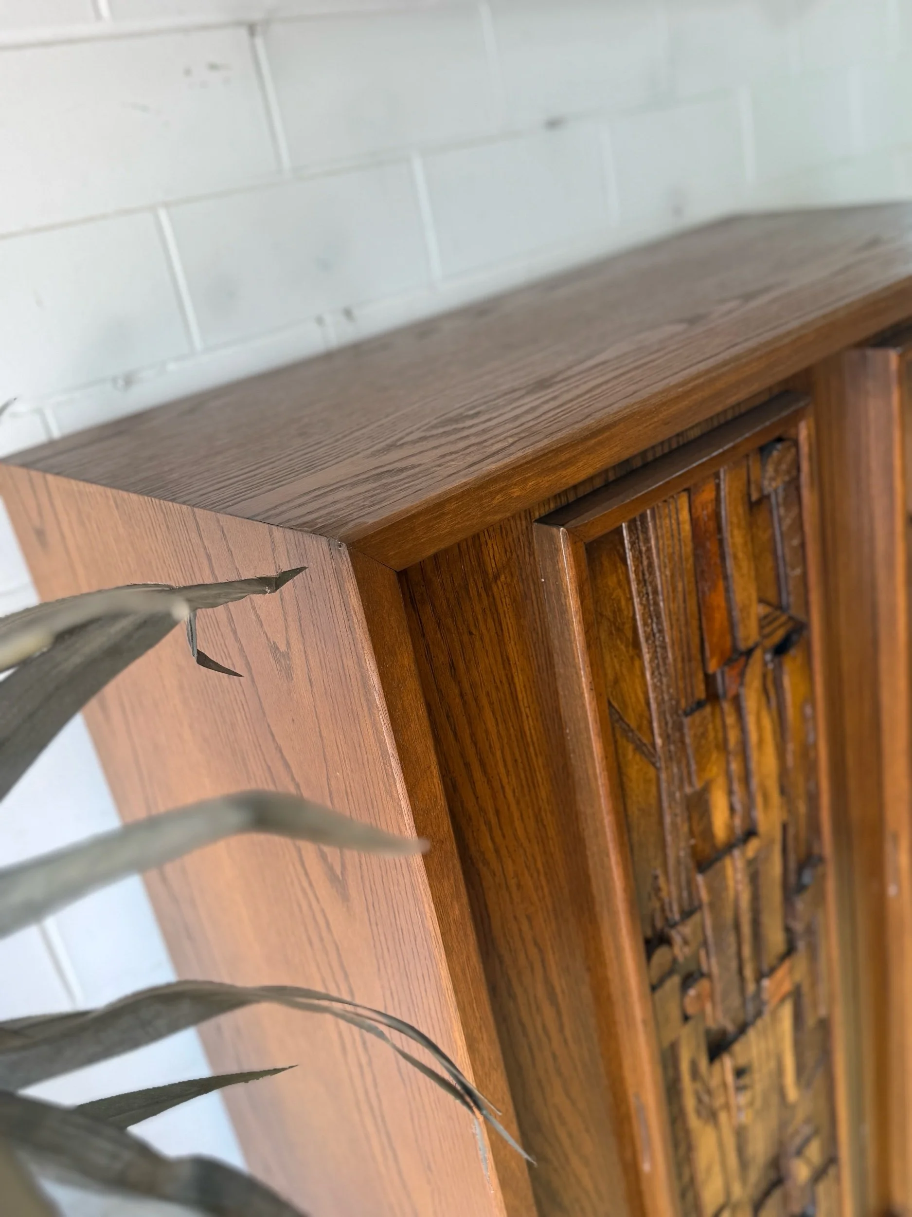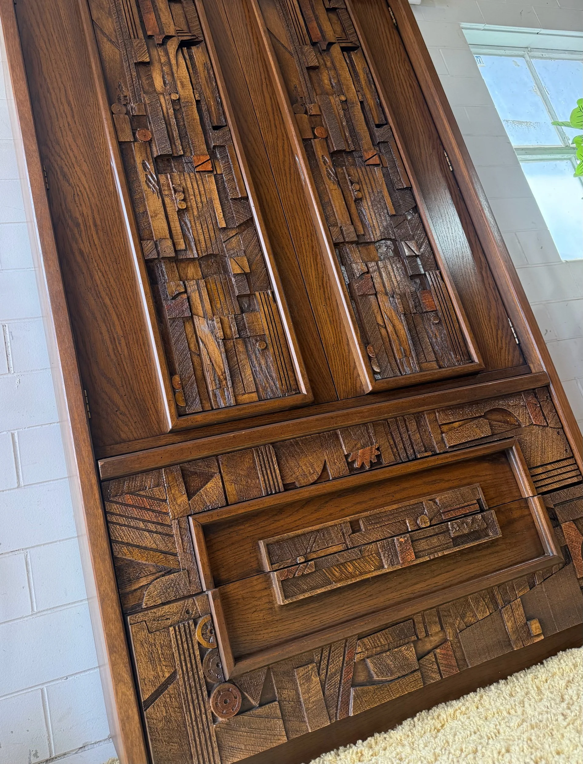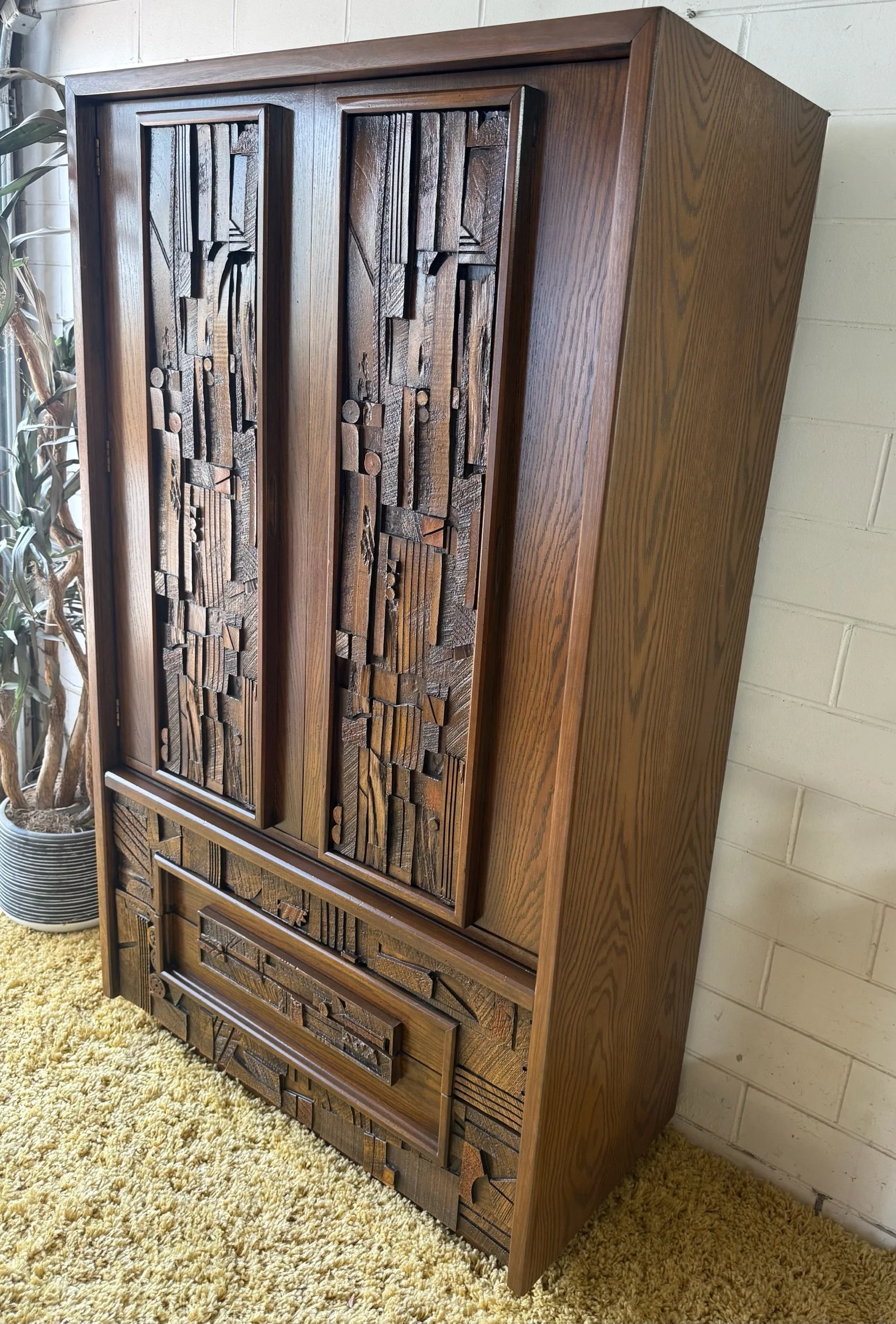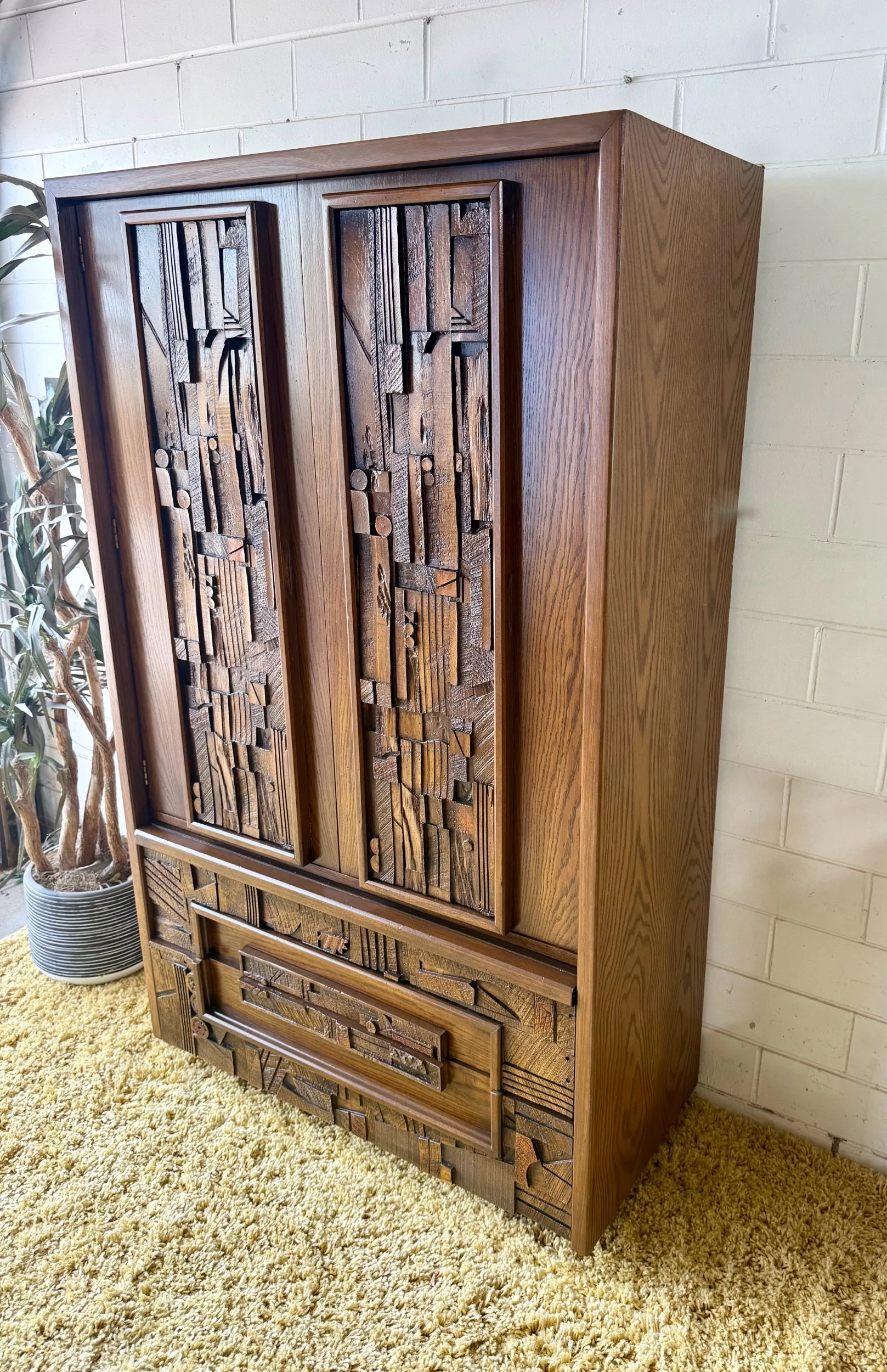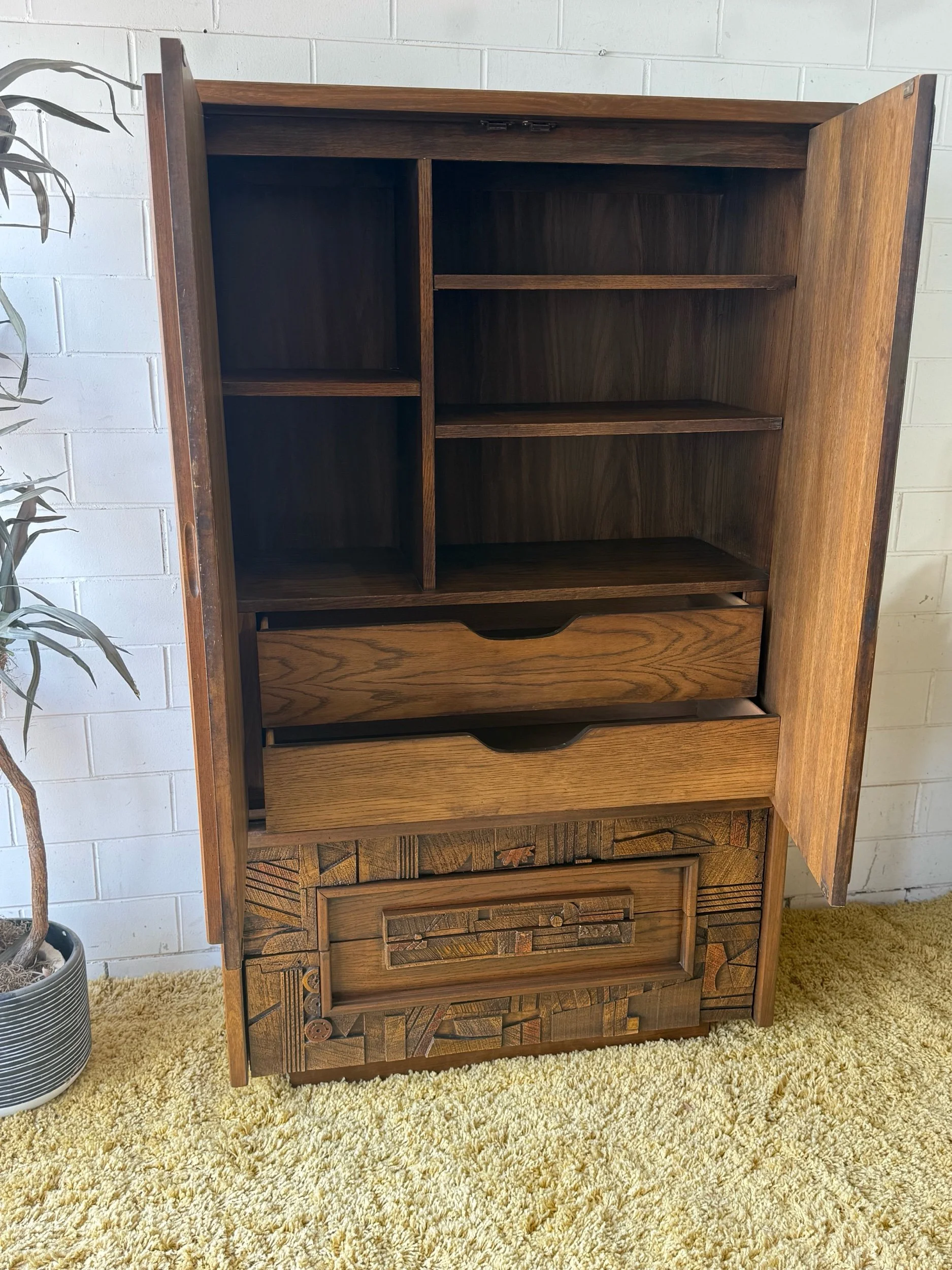 Refinished piece with two large drawers on the bottom on metal glides, and two drawers and shelves inside the large cabinet. The intricate design and durable build quality make it a true work of art, adding a touch of timeless sophistication to any room. Built to last with high-quality materials and exceptional craftsmanship, this armoire is a statement piece for any home From the Pueblo line of Lane brutalist bedroom sets circa 1970. Refinished to ‘like new’ condition this piece can last a lifetime or two.