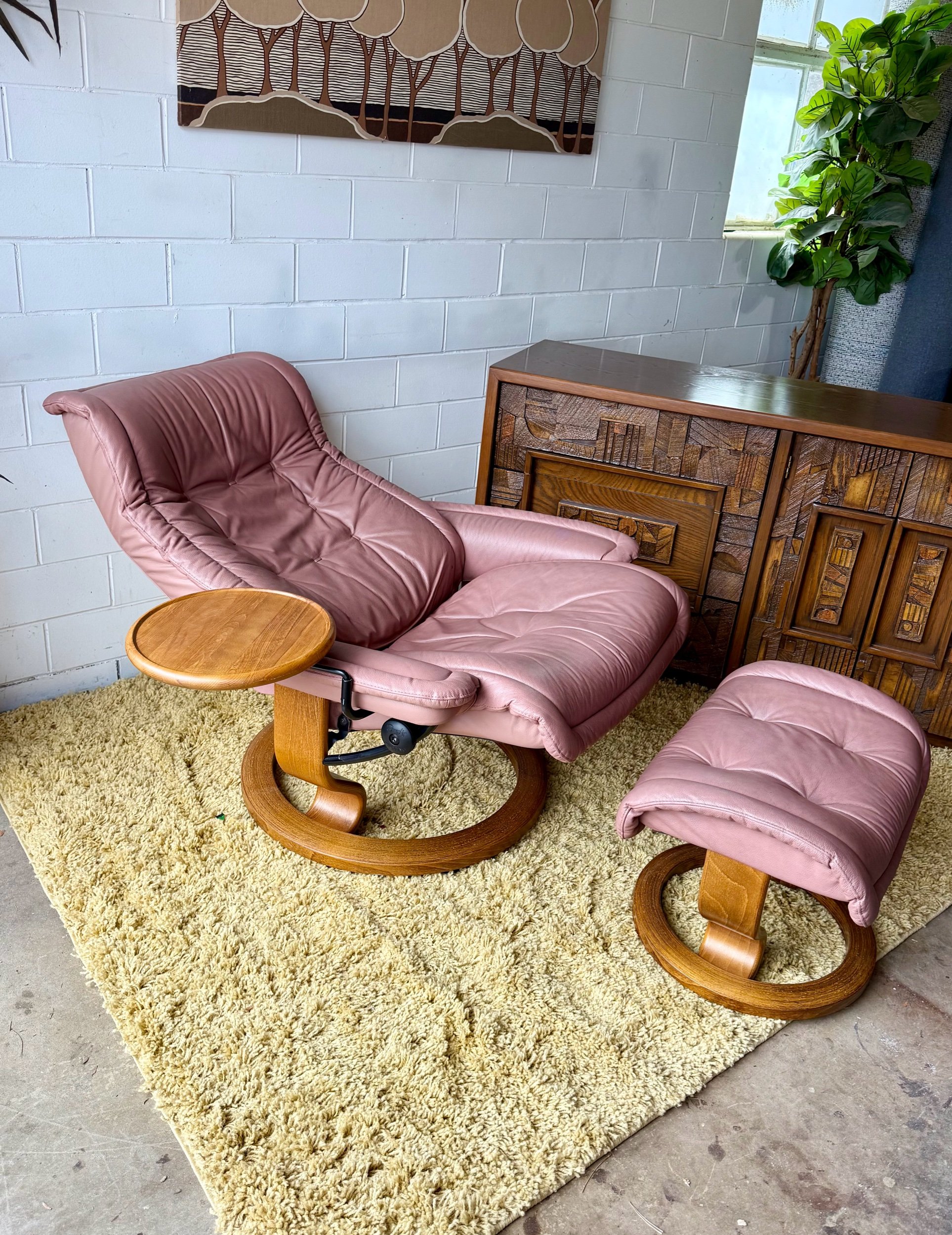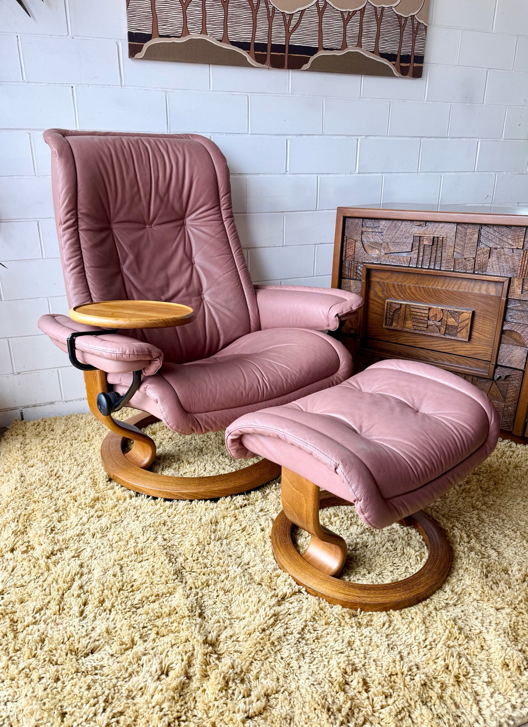 Classic Scandinavian Design, Unique Tufted Model. Nearly perfect all around. This set is gorgeous. I’m not going to lie it was a little hard to post. I may have a chair problem. This chair is supremely comfortable. The attached side table swivels 360. It’s a gaming chair, it’s a napping chair, it’s the best chair around.