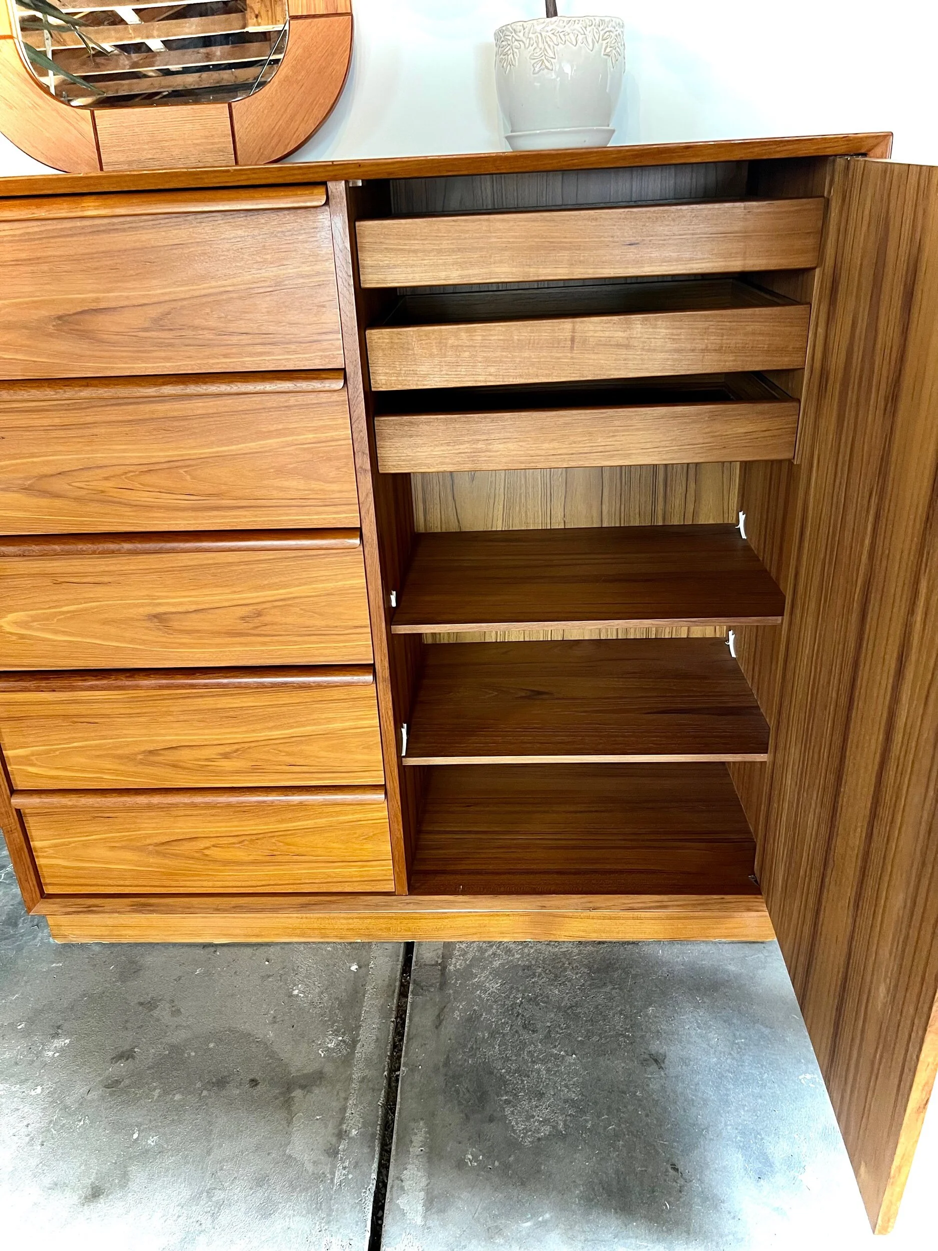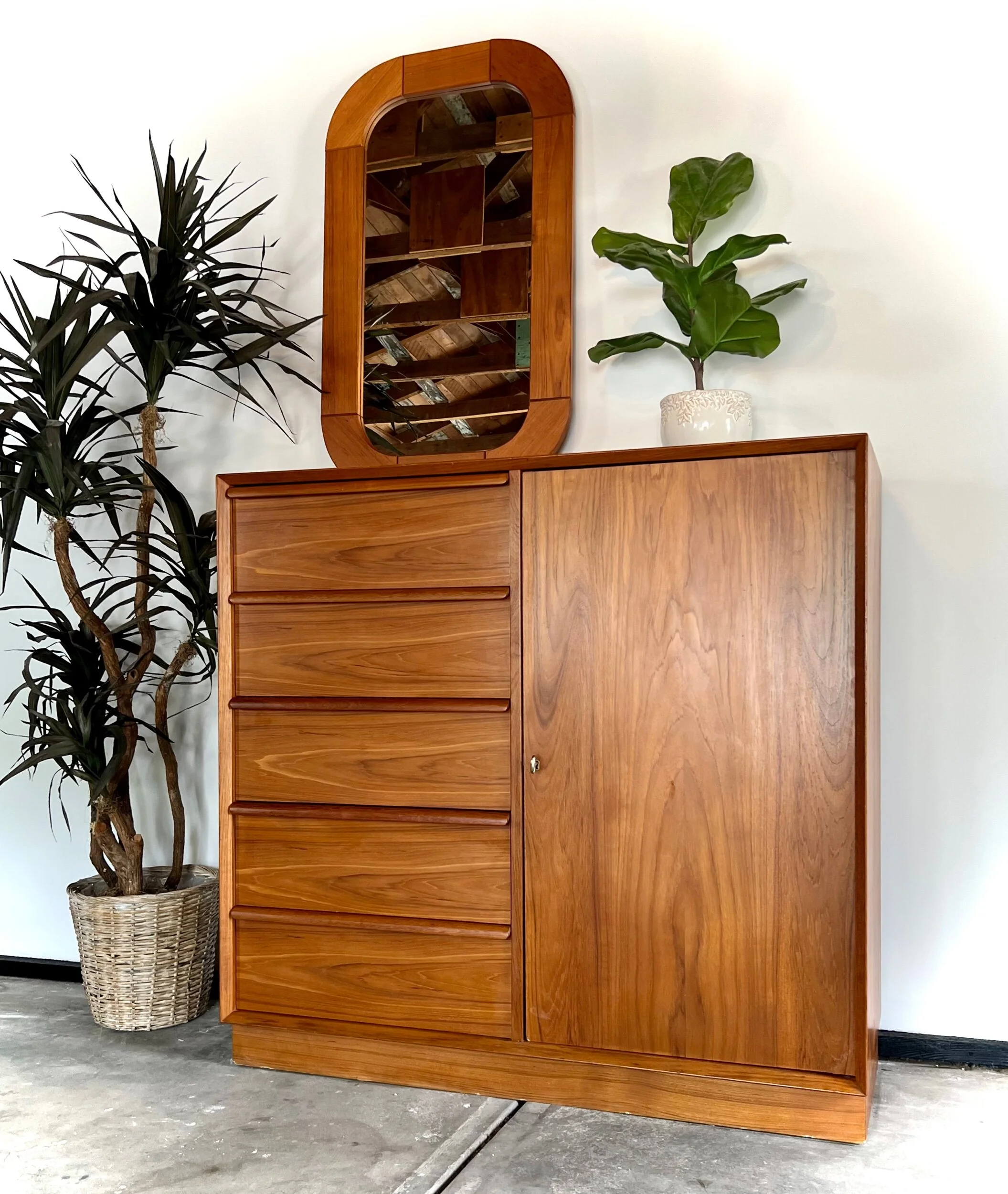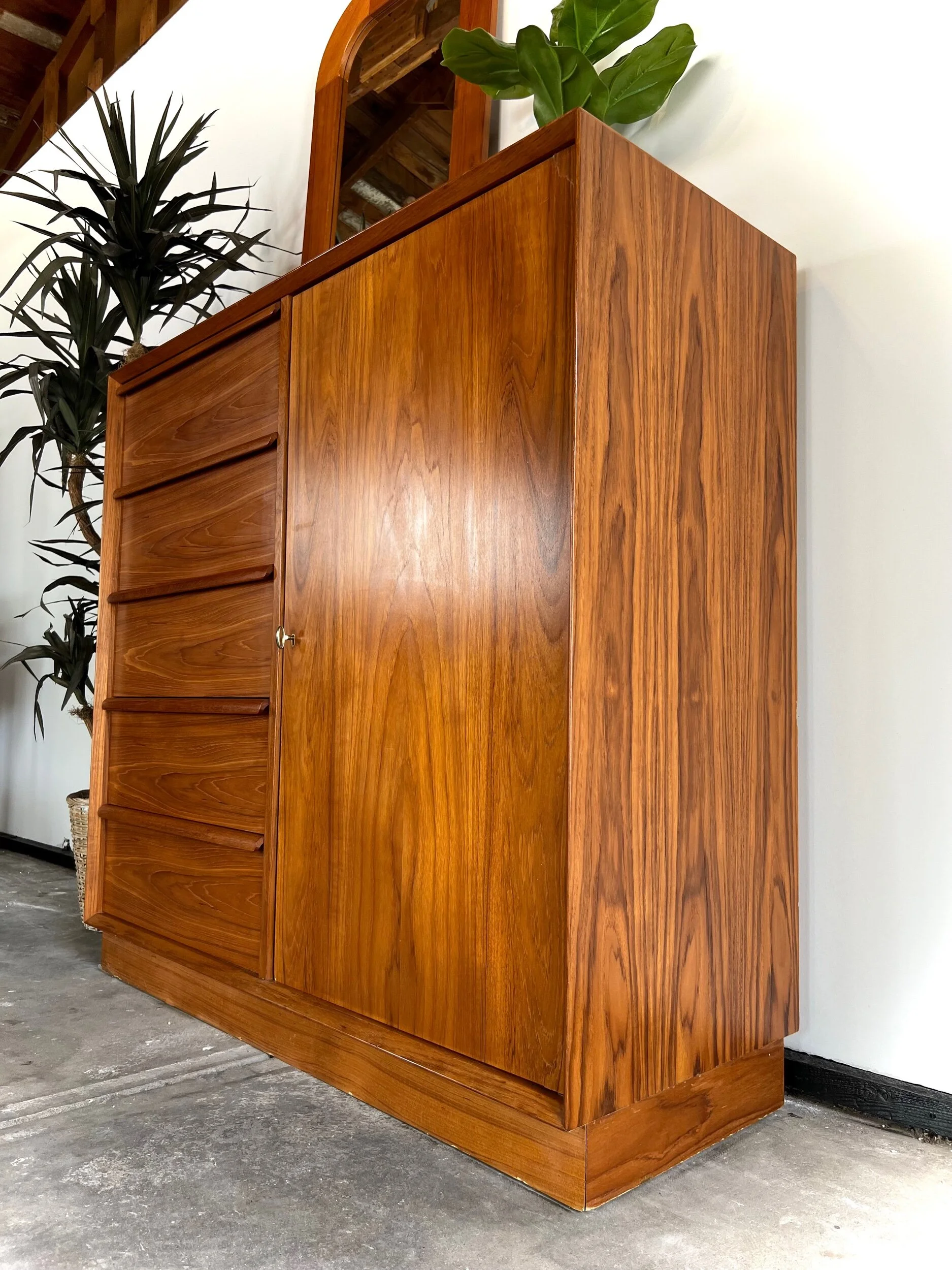 Danish Modern Vintage Wardrobe. Refurbished to excellent condition. Five drawers, with three smaller drawers inside the cabinet and shelves. Storage galore!